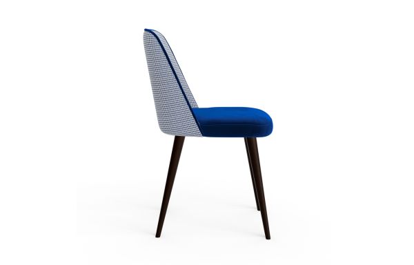 Original et classe, cette chaise Sia est revêtue d'un tissu velours bleu pétrole de très haute qualité combiné avec du jacquard au motif pied de poule petit modèle bleu. Ce tissu rend notre chaise un incontournable dans la tendance actuelle. Son assise et dossier sont garnis de mousse haute résilience pour vos offrir un confort exceptionnel. Le design de la chaise Sia apportera une élégance à votre pièce et créera une ambiance chaleureuse.